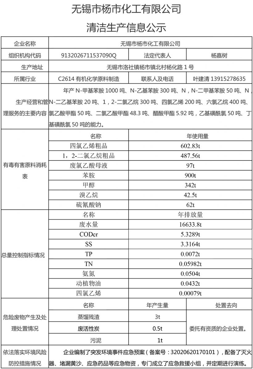 無(wú)錫市楊市化工有限公司清潔生產(chǎn)信息公示